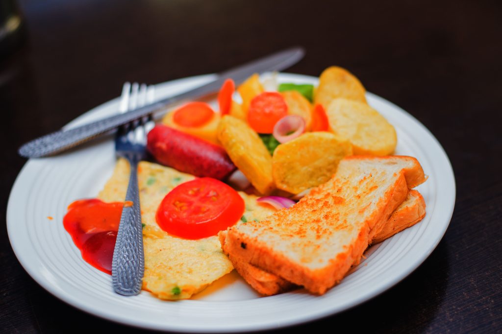 A classic breakfast combo with toast, omelette, chips, and fresh fruit for a perfect start to the day.