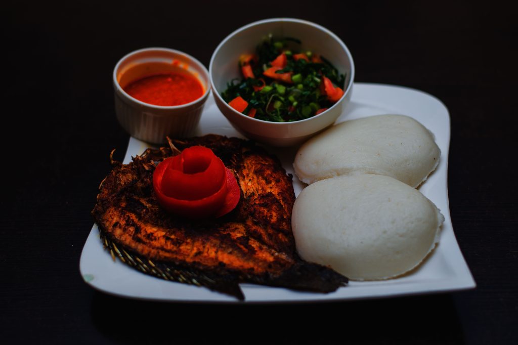 Traditional nsima served with perfectly grilled chambo, fresh greens, and tasty homemade sauce.
