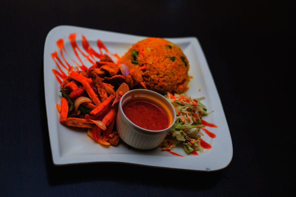Delicious spiced fried rice served with fresh veggies and a rich red sauce.
